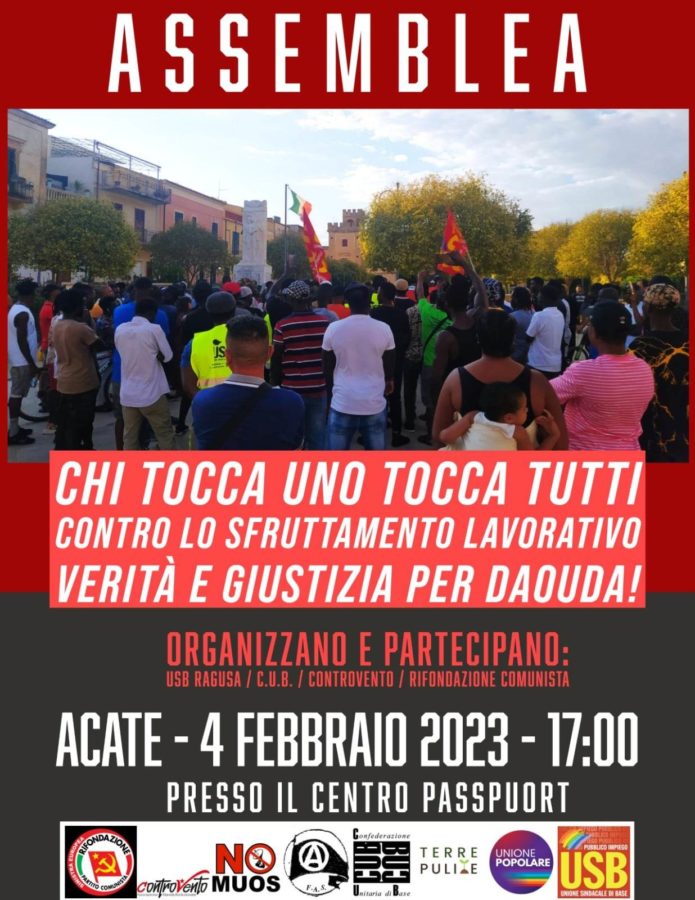 notizie e sulla cui sparizione sono ancora in corso le indagini della Procura di Ragusa, USB di Ragusa, C.U.B, l’Associazione Controvento e Rifondazione Comunista Sicilia tornano ad organizzare un’assemblea ad Acate contro lo sfruttamento lavorativo con i lavoratori e con tutti i soggetti politici, sindacali e del terzo settore. L’iniziativa si svolgerà il prossimo sabato 4 Febbraio presso il Centro “Passpuort” di Acate. Sarà un momento di confronto che vedrà protagonisti lavoratori, braccianti agricoli e militanti sindacali, che ogni giorno vivono sulla propria pelle lo sfruttamento lavorativo attuato “scientificamente” nella fascia trasformata. «Un dibattito non solo per chiedere verità e giustizia per Daouda – scrivono gli organizzatori – ma anche per ampliare quella rete che, in una realtà complessa come quella della fascia trasformata della nostra provincia, si adopera da tempo affinché lavoratori migranti e lavoratori italiani si organizzano più consapevolmente nel contrasto allo sfruttamento dell’attuale sistema».