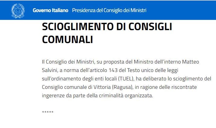 Il Consiglio dei Ministri, convocato per oggi alle 12, ha deciso: sciolto per mafia il Comune di Vittoria, nel Ragusano. Decade dalla carica il sindaco Giovanni Moscato e con lui tutto il consiglio comunale, arriveranno tre commissari prefettizi che dovranno guidare l’ente per almeno un anno e mezzo, prima che la città possa tornare alle urne.