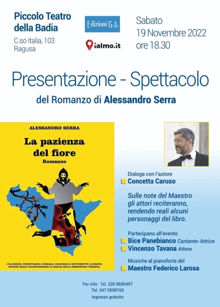 Dopo le varie presentazioni di successo nel Siracusano, il nuovo romanzo di Alessandro Serra edito da Edizioni G.A., “La pazienza del fiore“, approda anche a Ragusa. L’appuntamento è in programma per sabato 19 novembre a partire dalle ore 18:30 al Piccolo Teatro della Badia, in Corso Italia 103.