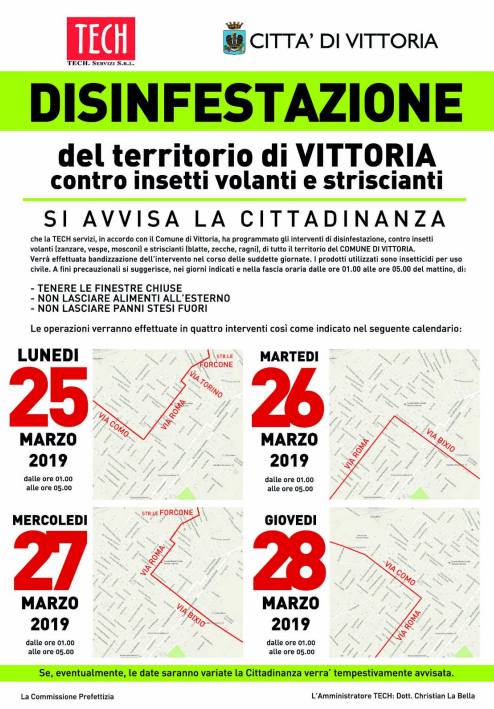 Il Comune di Vittoria ha programmato in tutto il territorio comunale un intervento di disinfestazione contro insetti volanti e striscianti.
