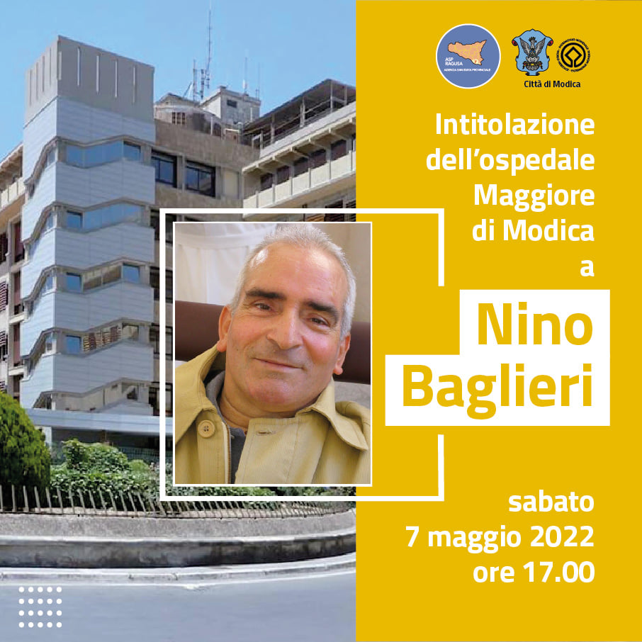 L’ospedale “Maggiore” di Modica sarà ufficialmente intitolato a “Nino Baglieri” sabato 7 maggio alle ore 17.00. Alla cerimonia sono state invitate le Autorità civili, militare e religiose e l’Assessore regionale della Salute, Ruggero Razza, ha assicurato la sua presenza. Una giornata dal forte valore simbolico quella di sabato prossimo perché ricorda «la preziosa eredità di un uomo che nella condizione di gravi di disabilità, riusciva a essere una grande risorsa e un grande aiuto per tutti gli altri». Queste parti si leggono tra le motivazioni della proposta di intitolazione rivolta dall’Amministrazione comunale di Modica all’ASP di Ragusa e al Prefetto di Ragusa che ha autorizzato l’intitolazione.