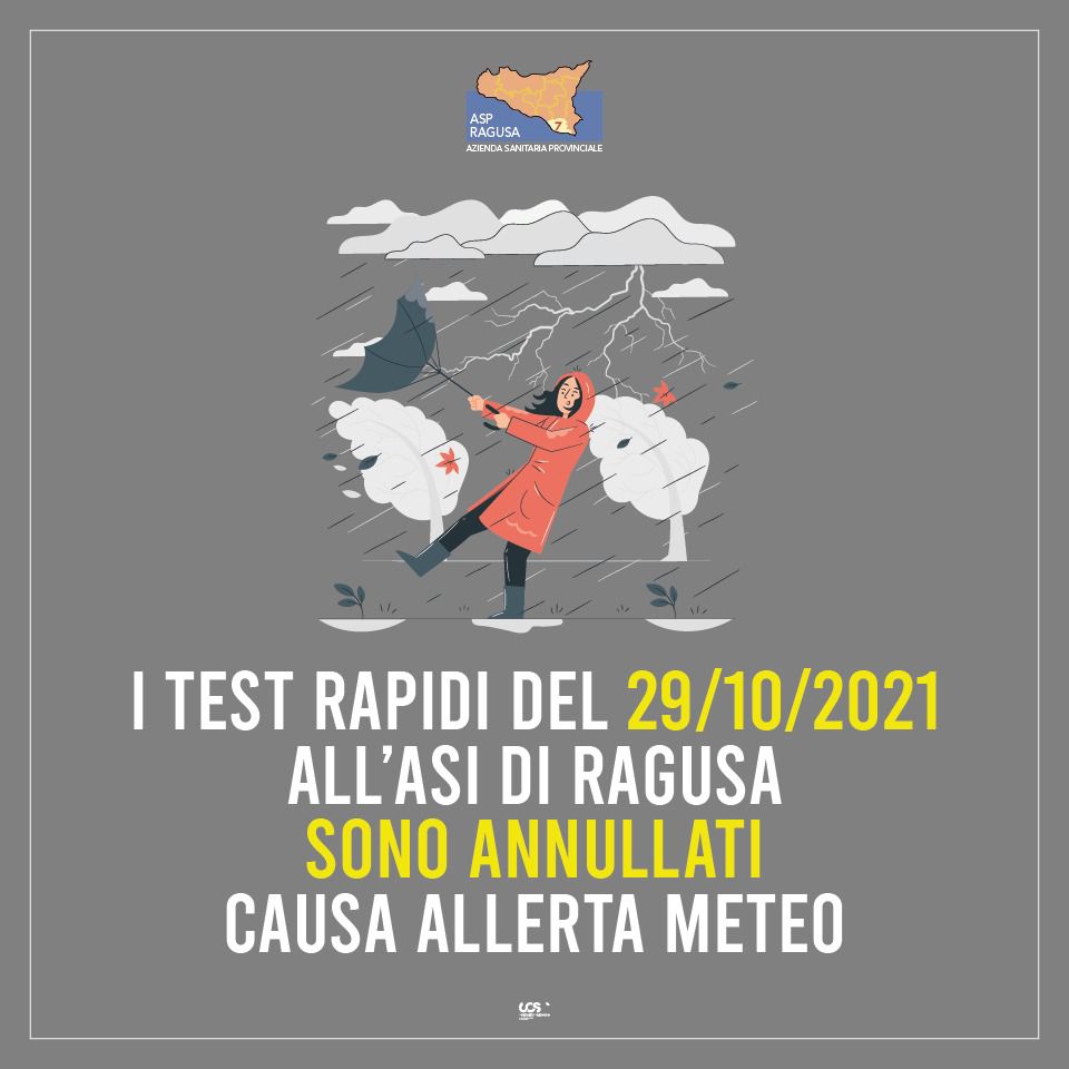 I test rapidi per lo screening anti-Covid all’Asi di Ragusa, programmati per la giornata di domani, venerdì 29 ottobre, sono stati annullati. Il provvedimento è stato ritenuto necessario a causa dell’ultima allerta meteo diramata dalla Protezione Civile regionale.