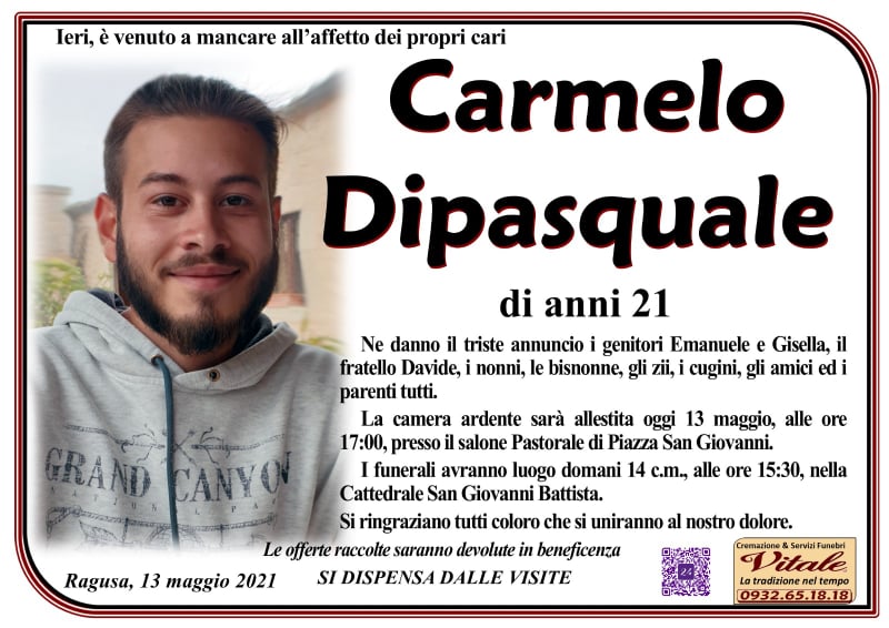 Oggi, nel salone Pastorale di piazza San Giovanni, a Ragusa, è stata allestita la camera ardente per dare l’ultimo saluto a Carmelo Dipasquale, il 21enne ragusano deceduto all’ospedale San Marco di Catania in seguito all’aneurisma cerebrale che lo ha colpito pochi giorni fa. I funerali si svolgeranno domani 14 maggio, alle ore 15.30, nella Cattedrale di San Giovanni Battista.