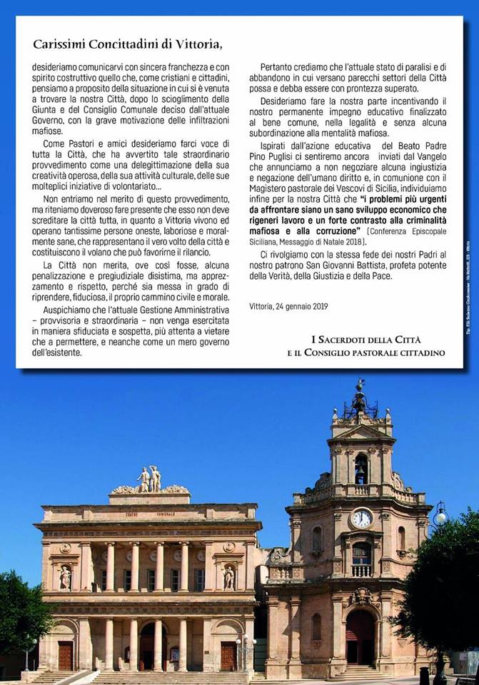 Sta facendo discutere la lettera che i sacerdoti di Vittoria e il consiglio pastorale cittadino hanno indirizzato nelle ultime ore ai vittoriesi. Una missiva nella quale si parla della delicata situazione politica e sociale del comune, esortando i cittadini ad uscire dal torpore, ad avere una reazione e a difendere la città. Fin qui nulla di male, se non fosse che si entra nel merito, senza troppi giri di parole, sulla questione dello scioglimento per mafia. “Una delegittimazione della creatività operosa di Vittoria, della sua attività culturale, delle sue molteplici iniziative di volontariato” viene definito, ma questo “non deve screditare la città tutta perché a Vittoria vivono ed operano tantissime persone oneste, laboriose e moralmente sane che rappresentano il vero volto della città” che “non merita alcuna penalizzazione e pregiudiziale disistima, ma apprezzamento e rispetto, perché sia messa in grado di riprendere, fiduciosa, il proprio cammino civile e morale”.