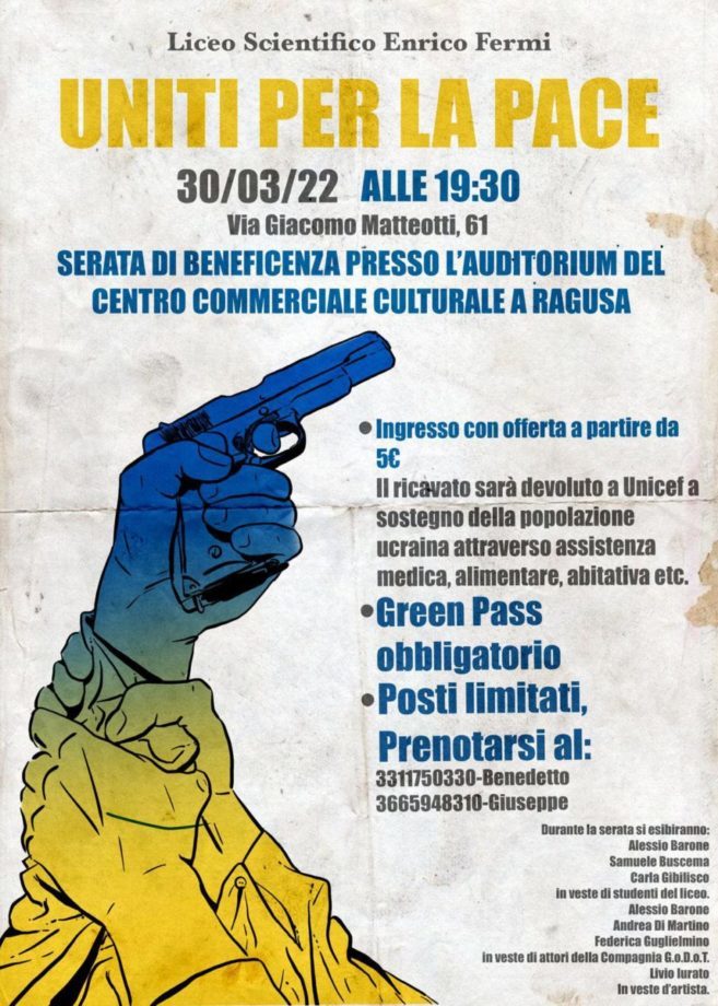 “Uniti per la pace” è il titolo dell’evento che si svolgerà oggi 30 marzo, a partire dalle ore 19:30, organizzato dal liceo scientifico di Ragusa. In occasione di questo evento, alcuni studenti e studentesse del liceo scientifico intratterranno i partecipanti con le loro performance musicali, canore, di ballo e di recitazione. La serata prevede un ticket di ingresso con un offerta base di €5. Il ricavato dell’evento benefico andrà interamente devoluto all’Unicef per sostenere le popolazioni colpite dalla guerra (attraverso assistenza medica, alimentare, abitativa, ecc), fine primario di questo evento. Appuntamento questa sera alle 19:30 in via Matteotti 61, al Centro commerciale culturale di Ragusa.