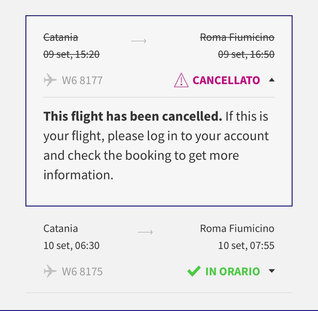 Continuano i disagi relativi all’improvvisa cancellazione di voli all’aeroporto Fontanarossa di Catania. L’ultimo episodio risale allo scorso venerdì 9 settembre, quando, il volo Wizzair delle 15.20 diretto a Roma Fiumicino – come dimostra la foto qui in basso – è stato cancellato senza alcun tipo di preavviso o spiegazione.