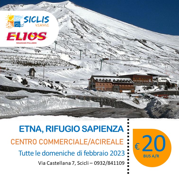 Per vivere la neve in tutta la sua magia, senza costi elevati, la Siclis Viaggi di Scicli si prepara per il mese di febbraio, durante il cuore dell’inverno, per farvi assaporare una giornata all’insegna del bianco. Tutte le domeniche di febbraio sono previste delle gite sull’Etna: destinazione il famoso Rifugio Sapienza, immerso nelle piste da sci. Il viaggio, al costo di 20 euro, prevede, durante il tragitto di ritorno, anche una tappa presso il Centro Commerciale di Acireale per una pausa relax all’insegna dello shopping.