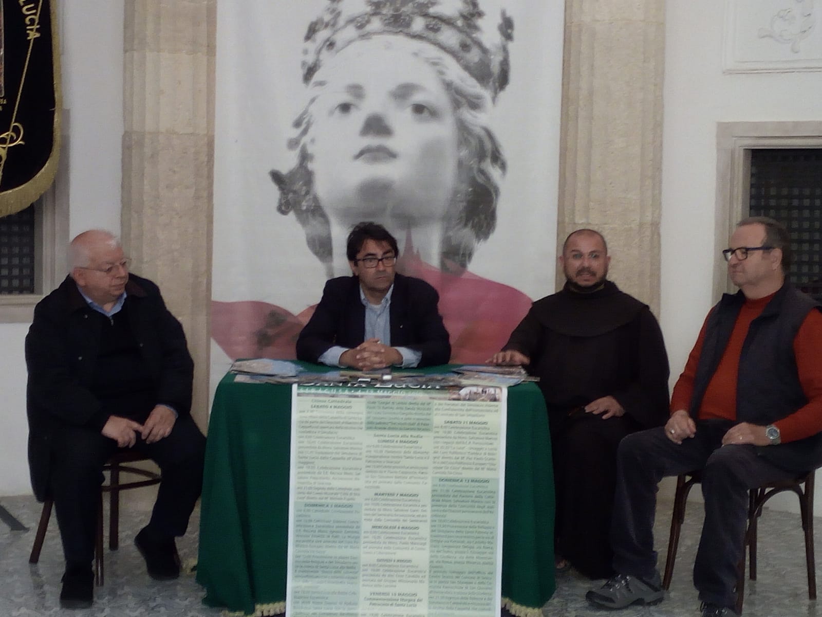 All’incontro con la stampa, tenutosi al Parlatorio delle Monache, accanto la chiesa di Santa Lucia alla Badia, ad Ortigia, erano presenti, oltre al presidente della Deputazione, Giuseppe Piccione, il parroco della Cattedrale e componente della stessa, mons. Salvatore Marino, fra Daniele Cugnata, rettore della Basilica di Santa Lucia al Sepolcro e i maestro di Cappella Benedetto Ghiurmino. Come da tradizione, i festeggiamenti saranno preceduti, sabato 4 di buon mattino dalla cerimonia di consegna delle chiavi della Cappella da parte dei Deputati al Maestro di Cappella e l’apertura della nicchia che custodisce in Cattedrale il Simulacro argenteo della Santa Patrona. Alle 11:45, con l’ausilio anche quest’anno di studenti e atleti del Circolo Canottieri Ortigia di Siracusa, la traslazione del simulacro dalla teca della Cappella verso l’altare maggiore della Cattedrale; in serata, alle ore 19:00, la Celebrazione eucaristica presieduta dall’arcivescovo di Siracusa, mons. Salvatore Pappalardo ed a seguire l’appuntamento, alle ore 21:00, con il concerto del Corpo Musicale “Città di Siracusa” diretto dal M° Michele Pupillo.