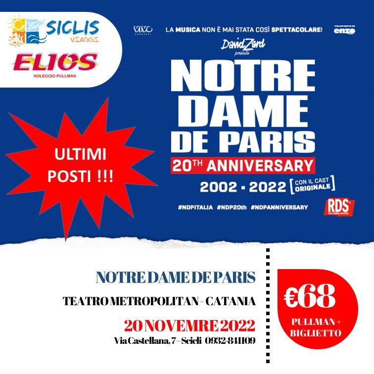 Ultimi posti disponibili sul bus di Siclis Viaggi che il prossimo 20 novembre partirà da Scicli e raggiungerà il PalaCatania per il ventennale dello spettacolo “Notre Dame de Paris“. La quota di partecipazione è di 68 euro, comprensiva del viaggio in autobus andata e ritorno e biglietto dello spettacolo. Per maggiori informazione e prenotare il posto sul bus chiamare lo 0932.841109 o recarsi direttamente in agenzia, in via Castellana 7, a Scicli.