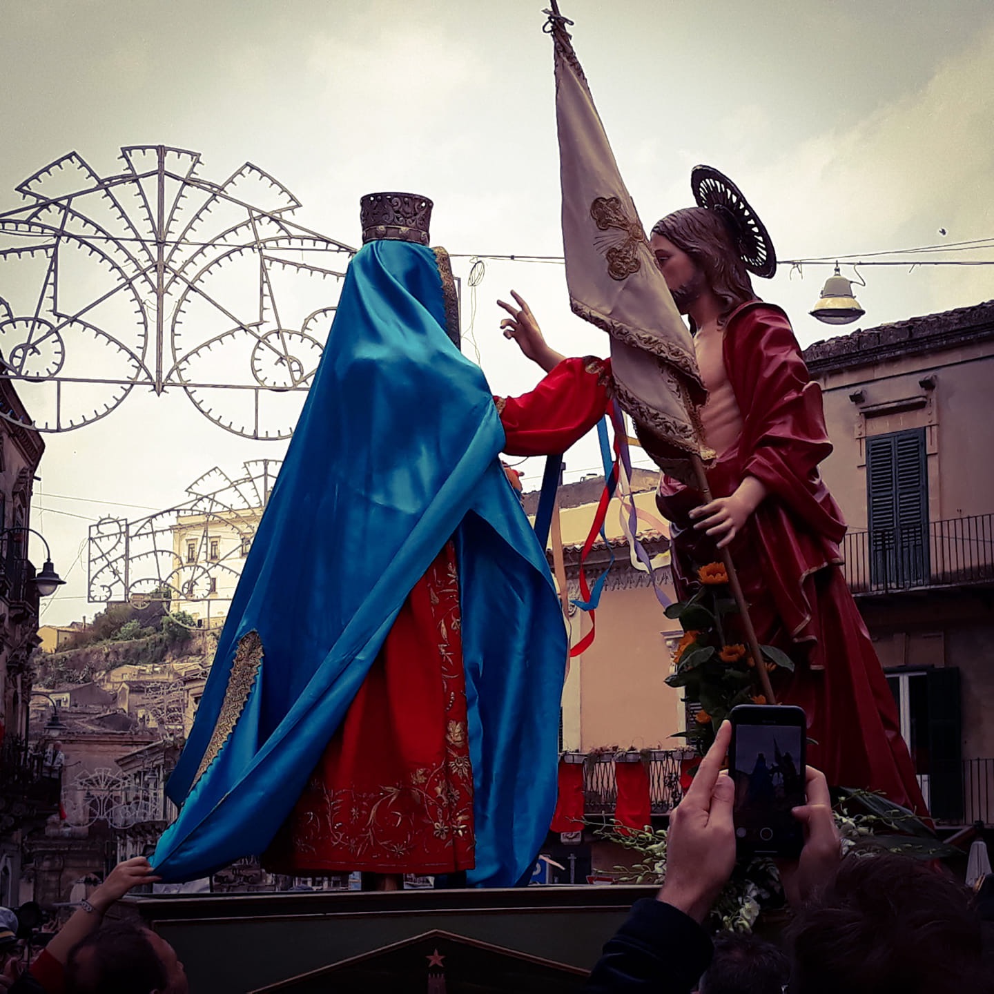 Il vento e l’allerta meteo, invece, non hanno rovinato un’altra delle feste caratterizzanti la Pasqua negli Iblei, ossia la Madonna Vasa Vasa di Modica, che va in archivio con un’altra edizione davvero straordinaria con numeri incredibili sia la mattina che nel corso dell’incontro serale, giunto al quarto anno. Otto i “baci”, cinque la mattina e tre in serata, che hanno scandito uno degli eventi più suggestivi della Pasqua ragusana, ma il più atteso resta il primo, a mezzogiorno in punto, in piazza Monumento, proprio di fronte al Municipio, tra una moltitudine di persone. Maria, come da tradizione, si è liberata del manto nero, portato in segno di lutto per la morte del Figlio, lasciando librare in cielo alcune colombe bianche mentre i fedeli hanno applaudito con trasporto. Il Cristo risorto si è avvicinato alla Madre e quest’ultima ha dato vita al cosiddetto “bacio”, un modo per esprimere la gioia della Resurrezione. Turisti provenienti da ogni dove hanno fatto da cornice a questo splendido momento. I riti pasquali avevano preso il via già di buon mattino. Alle 8,45, da Santa Maria di Betlem, per il sesto anno consecutivo, il simulacro della Madonna bardato a lutto aveva percorso le viuzze situate nella zona a monte della chiesa. Alle 10 era cominciata la solenne celebrazione eucaristica tenuta dal parroco don Antonio Maria Forgione. Intorno alle 11, in due tempi diversi, i simulacri sono usciti, dopo la messa solenne, dalla chiesa di Santa Maria di Betlem. Mentre il Cristo risorto ha seguito l’itinerario delle strade principali, il corteo con la Madonna bardata a lutto si è mosso, preceduto da un tamburino, lungo le viuzze più ricche di fascino del centro storico di Modica. A mezzogiorno l’incontro, il “bacio” e la benedizione alla folla. Gli altri due baci esterni mattutini dinanzi alla chiesa di San Pietro e dinanzi a Santa Maria di Betlem prima del rientro dei due simulacri. In chiesa si sono tenuti altri due “baci”, uno al centro dell’edificio di culto, l’altro sull’altare.