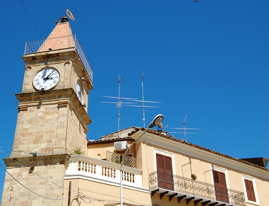 Torre dell’Orologio, Villarosa: in the Baroque style, the tower is located north-east of the octagonal Piazza Vittorio Emanuele. Built in 1849, the tower is closed at the top by a pyramid on which there is a flag showing the wind direction. Inside the quadrant the IV in Roman numeral is written in the form “IIII” according to an ancient use.