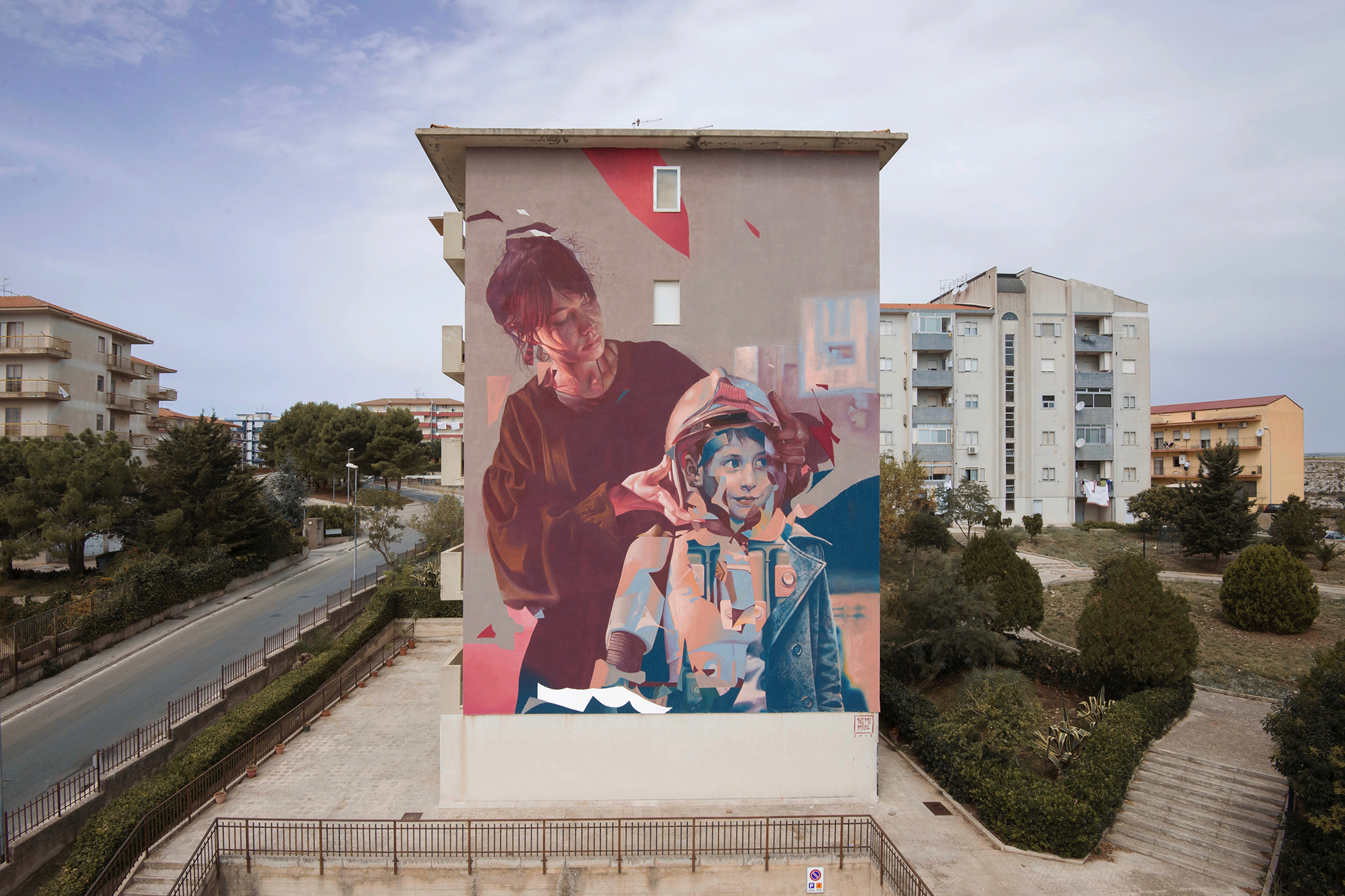 Il duo olandese Telmo Miel ha realizzato in via Canova un’opera dedicata alla maternità. L’immagine ritrae una madre che aiuta suo figlio, completamente equipaggiato per affrontare il futuro, ad indossare un elmetto. L’opera racconta la storia dell’amore di una madre, l’importanza della famiglia e la protezione che questa fornisce. Il bambino “del futuro”, con la sua armatura, si prepara a tutto ciò che potrebbe accadere, in funzione di ciò che accade nel mondo di oggi.