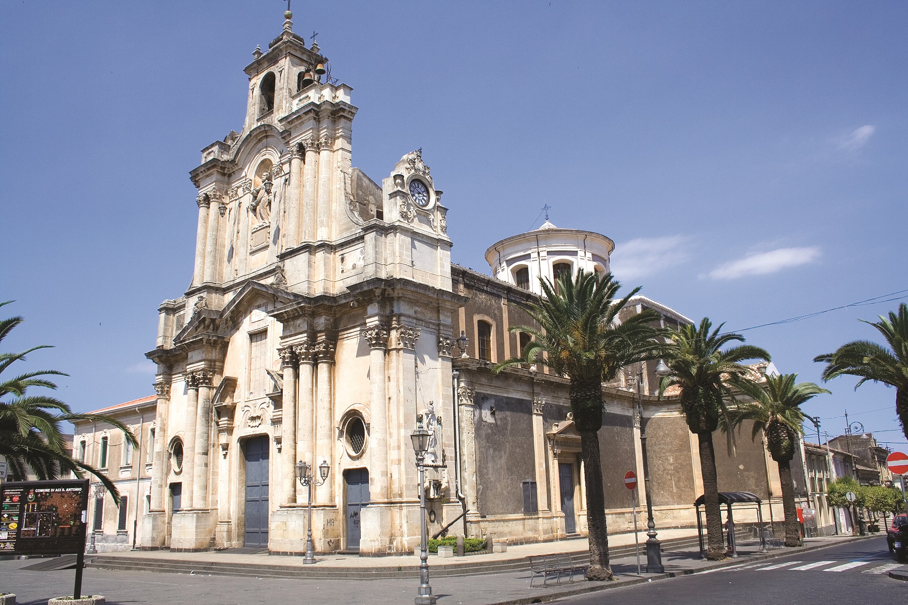 Origini – La storia di Aci Sant’Antonio è legata a quella di Acireale, che trae origine probabilmente dalla mitica città Xiphonia, della quale attualmente non si ha traccia. Notizie certe risalgono al 1169, quando dopo una forte eruzione gli abitanti delle zone costiere risalirono verso una zona boschiva, e diedero vita al borgo di Casalotto. Tale borgo rimase casale di Aquilia Vetere (oggi Acireale) fino a quando nel 1639 (anno del devastante sisma che danneggiò considerevolmente anche quest’area), a causa delle aspre lotte interne chiese, insieme ad altri casali, la separazione ratificata l’anno successivo. Non riuscendo a pagare i tributi, tuttavia, nel 1644 venne venduto alla famiglia Massa, l’anno seguente alla famiglia Diana e nel 1651 alla famiglia Riggio, sotto la quale rimase a lungo (furono i Riggio a far costruire i palazzi nobiliari in zona).