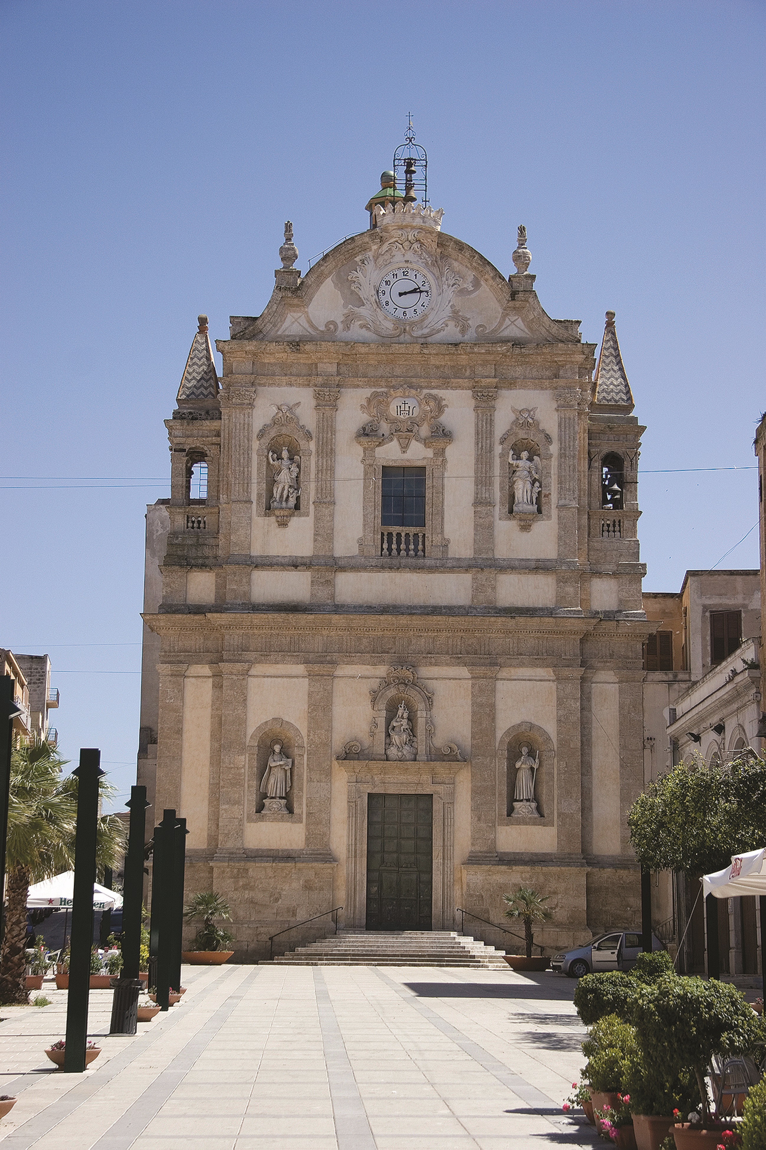 La principale chiesa della città è la chiesa madre, disegnata dagli architetti Angelo Italia e Giuseppe Diamante. Il suo interno è impreziosito da decine di affreschi del pittore fiammingo Guglielmo Borremans (1699). Il XVIII secolo fu anche un periodo di importanti restauri: fu eseguita allora la ristrutturazione della chiesa di Sant’Oliva, della chiesa dei Santi Paolo e Bartolomeo, della chiesa del Collegio e della chiesa di San Francesco di Paola. Nel 1667, su iniziativa di Mariano Ballo fu costruito il Teatro Ferrigno, oggi Teatro Cielo d’Alcamo. Tra gli edifici civili è da segnalare il castello dei conti di Modica, edificato nel XIV secolo nella vasta piazza della Repubblica per volere di Enrico e Federico Chiaramonte, successori dei Peralta nella signoria di Alcamo. Dopo vari passaggi di proprietà e ristrutturazioni, nel 1828 il castello passò in possesso del comune di Alcamo per ospitare il museo etnografico. Nel corso del Quattrocento il centro abitato fu dotato di mura difensive e delle porte Palermo, Corleone, di Gesù e Trapani. Nel 1536, in onore di Carlo V le porte Palermo e Trapani furono ricostruite e vennero aperte le nuove Porta Stella e Porta Nuova, poste all’ingresso ed alla fine dell’attuale corso VI Aprile (chiamato corso Imperiale).