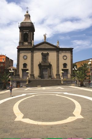 Centro storico – L’eruzione dell’Etna nel 1669 ha influito in modo determinante sull’aspetto e la struttura della cittadina. Dopo la devastazione, infatti, il centro fu ricostruito secondo una pianta urbanistica, inedita per una città siciliana che, vista dall’alto, ha le sembianze di una scacchiera. Tutte le vie senza nomi specifici si distinguono in rette e traverse in base al numero di riferimento. La lava ha cancellato molte delle più importanti espressioni artistiche e architettoniche del borgo, di cui rimane solo il volto della ricostruzione avvenuta a fine Seicento, ispirata rigorosamente allo stile dell’epoca, il barocco. Se si guarda agli edifici e alle numerose chiese del territorio, è facile rendersi conto di come la lavorazione della pietra lavica dell’Etna nei suoi molteplici aspetti ha dato vita a una fisionomia abitativa di inconfondibile fascino, impreziosita dall’opera artistica dei maestri scalpellini. Tra i monumenti religiosi, degna di nota è la Chiesa Madre dedicata all’Immacolata e a Santa Lucia, patrona della città, e risalente al Settecento. La facciata è abbellita da un campanile in stile barocco che custodisce una delle sei campane più grandi d’Italia, realizzata nel 1815. All’interno sono conservate le opere d’arte salvate dalla furia dell’eruzione, come un crocefisso in legno del Quattrocento, alcune tele risalenti al XVI secolo e soprattutto il reliquiario di Santa Lucia. Nelle vicinanze della chiesa troviamo il Giardino Pubblico e due dei palazzi di maggior pregio di Belpasso, Palazzo Scrofani, caratterizzato da una balconata in ferro battuto e da un bel portale in pietra lavica, e Palazzo dei Baroni Bufali di Santa Lucia. Si segnalano infine, presso la caratteristica piazza Dante, la Chiesa di Cristo Re e l’imponente Palazzo Lombardo. Attigue alla piazza vi sono la Casa Nino Martoglio, riconosciuta come bene monumentale, e la Casa di Antonino Russo Giusti che ospita il Museo Civico.