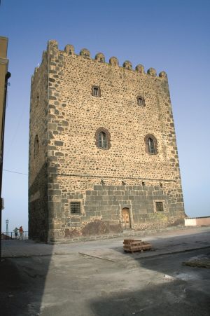 Il Castello di Motta Sant’Anastasia è il più piccolo dei tre dongioni edificati lungo la Valle del Simeto. Fu edificato tra il 1070 ed il 1074 sui resti di una torre araba per volere di Ruggero d’Altavilla. Il massiccio torrione a pianta rettangolare, alto circa 21 m, rappresenta un valido esempio di tipica struttura a carattere difensivo del tardo Medioevo. Intorno alla fortezza esistono ancora avanzi di una cinta muraria, all’interno della quale dovevano trovarsi altri edifici, i cui ruderi erano in parte visibili agli inizi del XX secolo. Probabilmente alla torre di Motta era attribuito un valore soprattutto militare-difensivo mentre la funzionalità residenziale sembrerebbe del tutto secondaria, in particolare a confronto con i non lontani donjons di Adrano e di Paterno’. La copertura a terrazza conserva quasi intatta la merlatura (22 merli a testa arrotondata); la struttura è suddivisa in tre elevazioni: solo la prima di queste presenta ancora le finestre originali, arco a sesto acuto all’esterno ed a tutto sesto all’interno. Le altre finestre quadrate degli altri livelli e la porta d’ingresso risalgono invece al XV secolo.