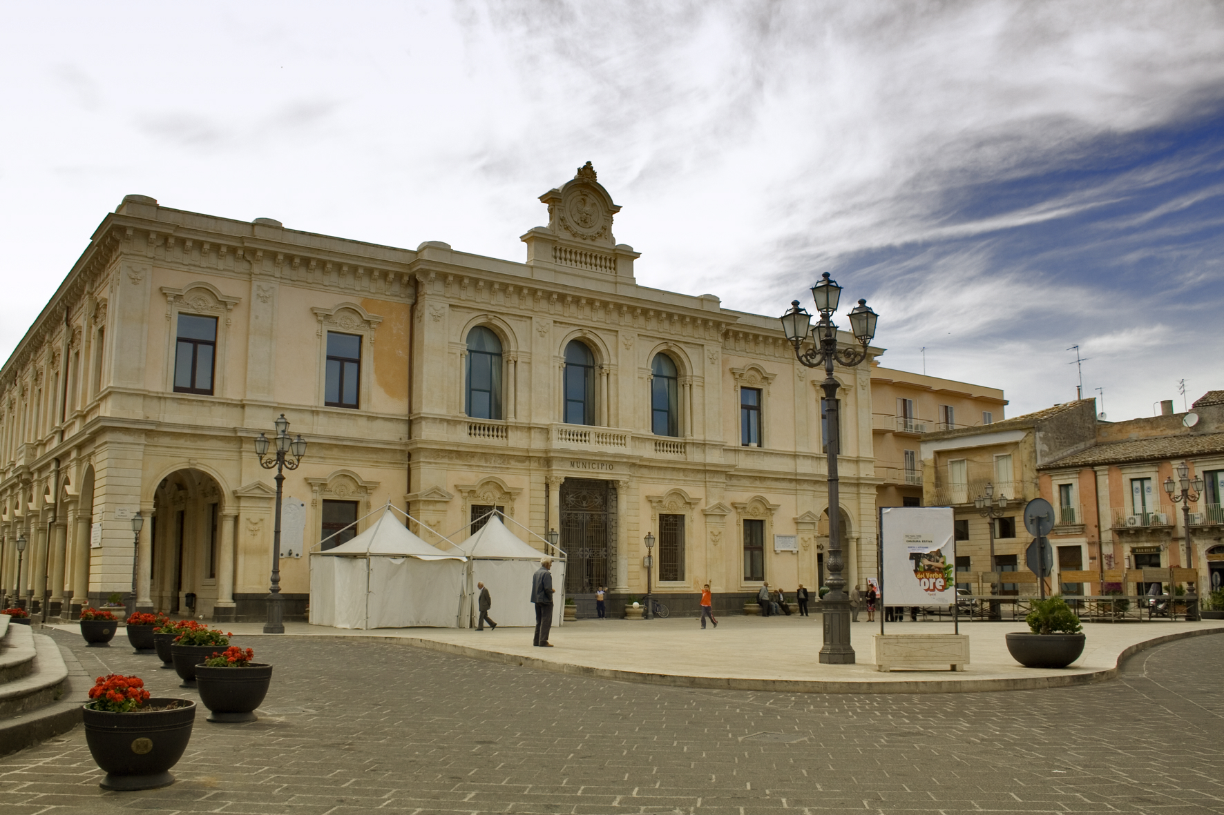 - Palazzo comunale: sito in Piazza del Popolo, è stato edificato intorno al decennio 1910 – 1920. Fu progettato in stile Liberty dall’ingegnere Polino e dal geometra Portuesi. La facciata si apre su una piccola scalinata, abbellita da una merlatura sovrastata da un cameo circolare in cui si inserisce un’aquila con le ali spiegate, emblema della città. Il palazzo presenta due ordini: quello inferiore è caratterizzato dalla presenza del portale centrale, “protetto” da un cancello in ferro battuto realizzato dai fratelli Leone, due possenti colonne ioniche a sostegno dell’architrave decorato da greche scolpite a bassorilievo, una serie di finestre sormontate da un timpano ed interrotte da pilastri recanti figure geometriche scolpite a bassorilievo. L’ordine superiore, invece, è caratterizzato da tre ampi finestroni centrali a forma di arco racchiusi da una balconata in pietra iblea. All’interno del Municipio si possono visitare la Sala consiliare ed il cortile dotato di un bel giardino mediterraneo.