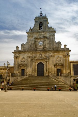 - Basilica di San Sebastiano: fu costruita sulla preesistente chiesa di San Rocco, crollata rovinosamente l’11 gennaio del 1693 in occasione del terribile terremoto del Val di Noto. Fu l’architetto Mario Diamante ad ideare il prospetto barocco della chiesa e a guidare i lavori per la ricostruzione terminati nel 1782. La facciata barocca è posta su una scalinata che domina la piazza principale della città, Piazza del Popolo. È divisa in tre ordini: in quello inferiore vi sono tre portali delimitati da due ordini di colonne corinzie a sostegno della trabeazione centrale della chiesa caratterizzata da disegni floreali scolpiti; il secondo ordine è caratterizzato da un orologio elettronico; infine il terzo ordine reca la torre campanaria. L’interno presenta un impianto ripartito in tre navate ed un imponente prospetto, alto 35 metri, costituito da tre ordini architettonici. La navata centrale è caratterizzata dalla volta con affreschi raffiguranti episodi della vita del Santo. L’altare maggiore in marmo policromo siciliano reca la nicchia di San Sebastiano, di forma arcuata. Le navate laterali sono ricche di importantissime opere d’arte settecentesche ed ottocentesche.