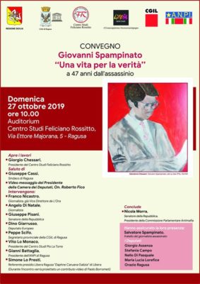 I lavori saranno conclusi da Nicola Morra, senatore della Repubblica, presidente della commissione parlamentare Antimafia. Hanno assicurato la loro presenza Salvatore Spampinato, fratello del giornalista assassinato, i deputati Giorgio Assenza, Stefania Campo, Nello Dipasquale, Marialucia Lorefice, Orazio Ragusa.