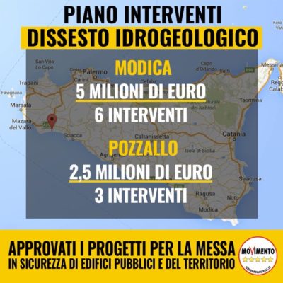 “La messa in sicurezza del territorio nazionale è una priorità che il nostro Governo sta perseguendo al fine di ridurre il rischio idrogeologico e favorire la prevenzione. L’obiettivo è quello di scongiurare le drammatiche conseguenze che gli eventi metereologici avversi hanno provocato in questi anni.” E’ quanto afferma la presidente della Commissione Affari Sociali della Camera dei Deputati, Marialucia Lorefice (M5S), che riferisce: “Siamo molto soddisfatti che sia stato firmato il decreto interministeriale del ministero dell’interno di concerto con il MEF con il quale vengono assegnati 5 milioni di euro al Comune di Modica e 2.5 milioni di euro al comune di Pozzallo per la realizzazione di 9 interventi complessivi di messa in sicurezza degli edifici e del territorio. Le risorse sono state assegnate ai comuni che hanno presentato richiesta di contributo entro il 15 settembre del 2019, sulla base di progetti inseriti in uno strumento programmatorio, come previsto dalle norme della Legge di Bilancio 2019, (approvata il 30 dicembre 2018), volte a supportare i Comuni nei progetti di recupero del territorio, tesi a: ridurre il rischio idrogeologico, mettere in sicurezza strade, ponti e viadotti, mettere in sicurezza edifici, con precedenza per quelli scolastici. Si tratta, di opere già programmate dai Comuni prima dei danni alluvionali dei mesi scorsi. Ci sono buone notizie anche per gli altri Comuni – aggiunge la parlamentare iblea che spiega – nella legge di Bilancio 2020 recentemente approvata, abbiamo incrementato da 4.9 a 8.8 miliardi di euro gli stanziamenti per la concessione di contributi ai comuni per la messa in sicurezza degli edifici e dei territori, includendo l’efficientamento energetico dei fabbricati tra le opere finanziabili. Inoltre, abbiamo ampliato l’ambito temporale di applicazione della norma, prevedendo risorse fino al 2034″.