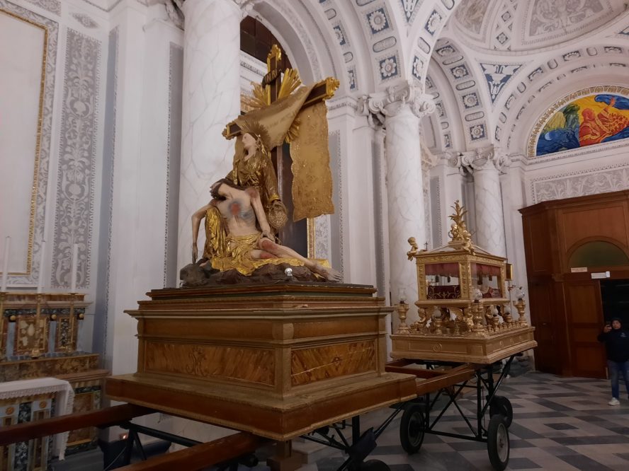 Un altro momento molto atteso è quello previsto per domani, Sabato Santo, quando, a mezzogiorno in punto, sul sagrato della basilica ci sarà, da parte dell’arcidiacono parroco, il sacerdote Girolamo Alessi, la benedizione alle uova, simbolo dello schiudersi della vita nuova. La veglia pasquale nella notte santa, invece, prenderà il via alle 20 e sarà caratterizzata dalla liturgia del fuoco e canto dell’annuncio pasquale, dalla liturgia della Parola, dalla liturgia battesimale e rinnovo delle promesse battesimali. E, ancora, dalla liturgia eucaristica. Al termine della veglia, processione eucaristica per le seguenti vie: piazza Santissima Annunziata, Duca D’Aosta, Principessa Elena, Mons. Ruscica, Iacono, piazza Fonte Diana, Degli Studi, papa Giovanni XXIII, piazza Santissima Annunziata, rientro in basilica. Al termine della processione,un altro dei momenti molto attesi dai fedeli con la benedizione eucaristica e la discesa dei simulacri. Alle 21, inoltre, è in programma l’accensione della scalinata della basilica artisticamente illuminata.