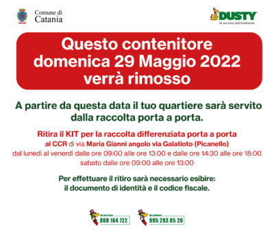 I volontari che opereranno per Dusty consegneranno agli utenti un avviso o, in assenza, lo recapiteranno nella buca della posta, per comunicare che il kit della differenziata deve essere ritirato dall’utente al CCR di Picanello. Per gli utenti del quartiere Ognina/Picanello che non fossero in possesso dell’apposito kit di contenitori specifici per la raccolta differenziata, Dusty ha allestito un punto di ritiro all’interno dei locali del Centro comunale di raccolta di Via Maria Gianni angolo Via Galatioto a Picanello (aperto al pubblico dal lunedì al venerdì dalle 9.00 alle 13.00 e dalle 14.30 alle 18.00; il sabato solo la mattina dalle 9.00 alle 13.00). Per ritirare il kit sarà necessario esibire l’avviso ricevuto di mancata consegna, un documento valido d’identità e il codice fiscale del titolare della cartella Tari.
