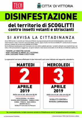 L’intervento, che sarà effettuato dalla Tech Servizi, interesserà nella prima fase – dal 25 al 28 marzo – il territorio di Vittoria, e nella seconda fase – dal 2 al 3 Aprile – quello di Scoglitti. Durante la disinfestazione, che avverrà di notte, dall’una alle cinque, si raccomanda ai cittadini di tenere le finestre chiuse e di non lasciare fuori panni stesi e alimenti.