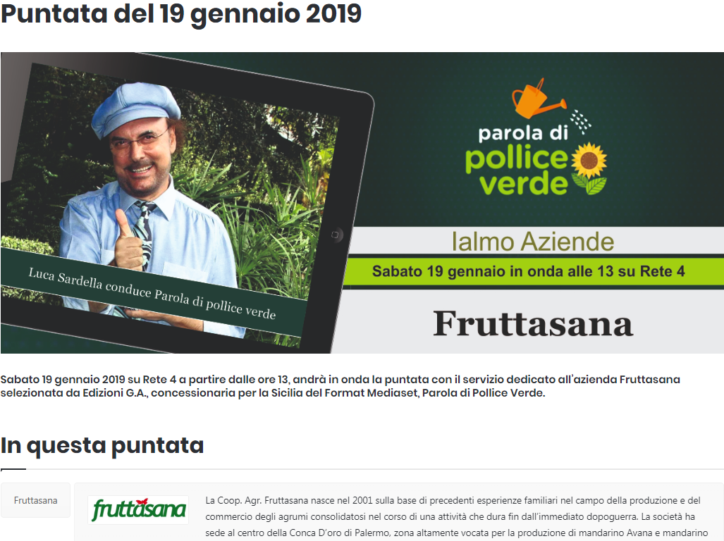 Sabato 19 gennaio su Rete 4, a partire dalle ore 13, riflettori nuovamente accesi sulla Sicilia. All’interno della puntata del Format Mediaset, Parola di Pollice Verde, infatti, andrà in onda il servizio dedicato all’azienda Fruttasana selezionata da Edizioni G.A., concessionaria per la Sicilia del programma curato e condotto da Luca Sardella.