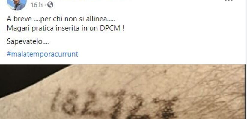 E’ polemica sul post del deputato siciliano di Attiva Sicilia, ex M5S, Sergio Tancredi che su Facebook ha pubblicato una foto con un tatuaggio che ricorda quelli fatti agli ebrei nei campi di concentramento associandolo al Green Pass e ha scritto: “A breve … per chi non si allinea….Magari pratica inserita in un Dpcm!”