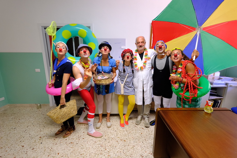 Ieri mattina i clown dottori, in abiti da bagnanti, hanno simpaticamente fatto irruzione presso il Dh Oncologico e l’Hospice per consegnare a pazienti, familiari e personale sanitario, le cartoline artistiche realizzate appositamente per l’occasione
