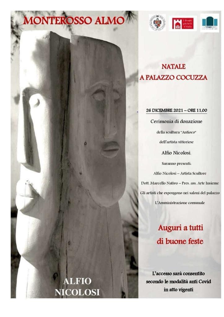 L’artista vittoriese Alfio Nicolosi omaggerà il Comune di Monterosso Almo con la scultura in pietra “Antioco” da lui realizzata. Domani la cerimonia di consegna nei locali di Palazzo Cocuzza. Saranno presenti, oltre allo scultore Alfio Nicolosi, il dottor Marcello Nativo (Presidente Ass. Arte Insieme) e gli artisti della collettiva d’arte.