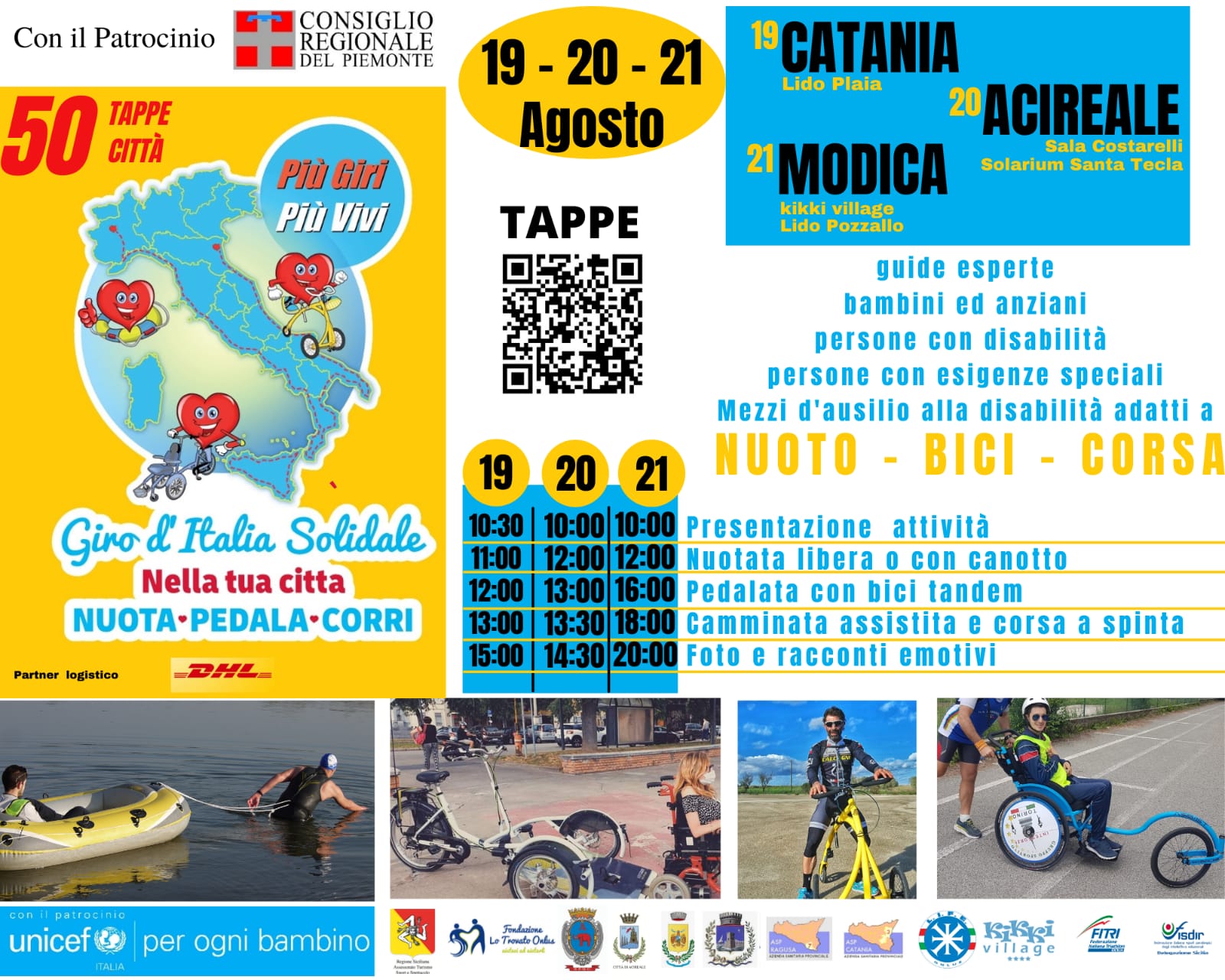 È la Fondazione “Lo Trovato Onlus” a ospitare le tappe siciliane che ha scelto proprio la città di Pozzallo e precisamente nella postazione di “Mare senza frontiere 3.0” che accoglierà l’arrivo degli atleti che hanno aderito alla kermesse. Appuntamento, quindi, il 21 agosto – Mare senza frontiere – a partire dalle ore 10.00 con l’attività in acqua: nuotata libera o con canotto. A seguire la pedalata con bici tandem, la camminata assistita e corsa a spinta.