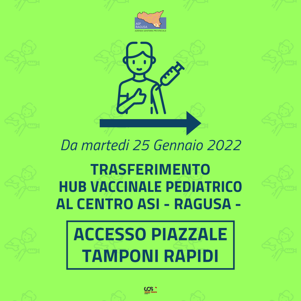 L’Azienda Sanitaria di Ragusa comunica che, a partire, da domani – 25 gennaio – l’Hub vaccinale ex ospedale Civile – dedicato alla vaccinazione pediatrica – 5/11 anni – sarà operativo nell’Hub vaccinale del Centro ASI. L’Hub pediatrico avrà un ingresso dedicato, infatti si accederà dal piazzale dove si effettuano i test rapidi in modalità drive in. Per gli orari basterà consultare il sito o visitare la pagina Facebook dell’ASP Ragusa. La nuova logistica renderà ancora più agevole e fruibile il servizio di vaccinazione anti Covid -19.