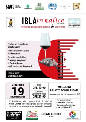 E’ tutto pronto per il grande evento ideato e organizzato dallo stilista e imprenditore internazionale di origine vittoriese Diego Cortez, in programma venerdì 19 novembre a Ragusa Ibla. “Ibla in calice”, percorso enogastronomico e culturale, accoglierà artisti, ospiti e pubblico nell’incantevole cornice dei Magazzini di Palazzo Donnafugata, a partire dalle ore 19.