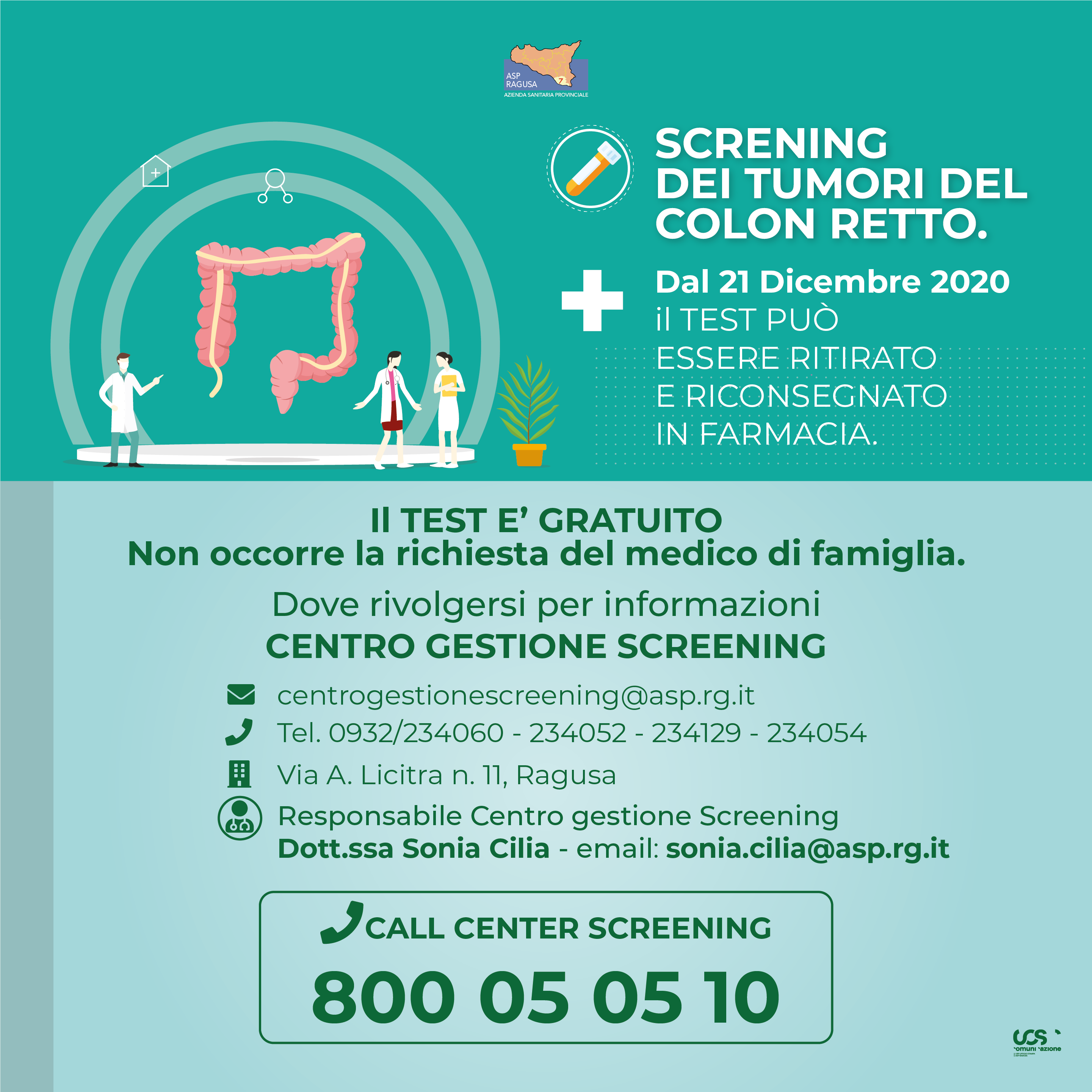 Il Centro Gestione Screening dell’Asp di Ragusa, responsabile dr.ssa Sonia Cilia, comunica che dal 21 dicembre 2020, il test per la ricerca del sangue occulto nelle feci è gestito dalle Farmacie territoriali convenzionate che hanno aderito al protocollo d’intesa fra l’Asp di Ragusa, Federfarma, Associazione distributori farmaceutici (ADF) e Federfarma servizi. Obiettivo primario è quello di potenziare la prevenzione del tumore del colon retto e migliorare l’accesso al servizio per l’utenza.