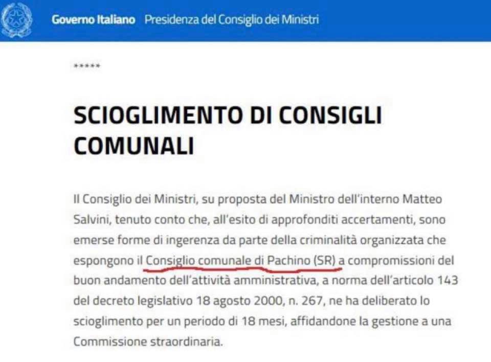 “Il consiglio dei Ministri, su proposta del Ministro all’interno Matteo Salvini, tenuto conto che, all’esito di approfonditi accertamenti, sono emerse forme di ingerenza da parte della criminalità organizzata che espongono il Consiglio comunale di Pachino (Sr) a compromissioni del buon andamento dell’attività amministrativa, a norma dell’articolo 143 del decreto legislativo 18 agosto 2000, n. 267, ne ha deliberato lo scioglimento per un periodo di 18 mesi, affidandone la gestione a una Commissione straordinaria”.