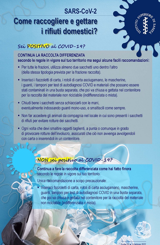 Dal prossimo 26 marzo in Sicilia cambieranno le modalità operative per la gestione della raccolta differenziata dei rifiuti provenienti da soggetti positivi e non positivi al Covid-19. Infatti, con una nota del 21 marzo 2022, la Regione Siciliana – Assessorato dell’Energia e dei Servizi di Pubblica Utilità – Dipartimento dell’Acqua e dei Rifiuti – Servizio 5 – Gestione Integrata Rifiuti, in considerazione della scadenza dell’Ordinanza n° 2/Rif/2021 del Presidente della Regione del 25 marzo prossimo, ai fini della gestione della raccolta dei rifiuti urbani provenienti da soggetti positivi al COVID 19 e da soggetti non positivi ha ritenuto opportuno attenersi alle linee d’indirizzo predisposte dall’Istituto del Servizio Sanitario (ISS), che ha riesaminato le modalità di raccolta dei rifiuti seguendo le regole della raccolta differenziata accompagnate da alcune semplici raccomandazioni, come da allegata disposizione predisposta dall’Istituto Superiore di Sanità.