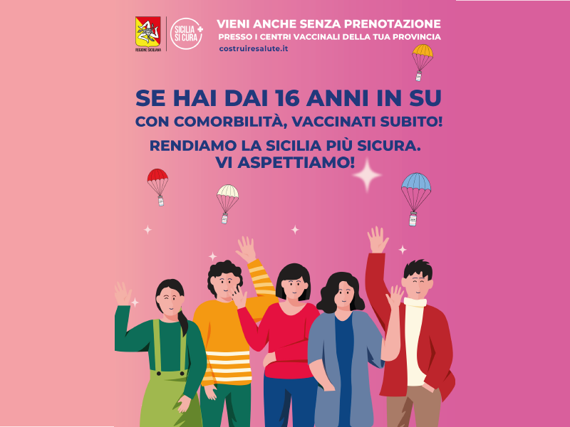 Al via in Sicilia la vaccinazione riservata ai soggetti adulti, senza limitazione d’età, affetti da patologie o da situazioni di compromissione immunologica tali da aumentare il rischio di sviluppare forme severe di Covid-19 seppur senza quella connotazione di gravità riportata per le persone fragili. Infatti, da oggi sono attive le procedure di prenotazione per gli Hub della provincia di Ragusa sulla piattaforma di Poste Italiane – prenotazioni.vaccinicovid.gov.it -, a favore dei soggetti in fascia d’età superiore ai 16 anni – coorte 2005 – , con comorbilità, che rientrano nella Categoria 4, con codice di esenzione per patologia, in coerenza con quanto previsto dalla direttiva della Struttura Commissariale per l’emergenza Covid-19, nell’ambito della campagna di somministrazione rivolta alle categorie prioritarie.