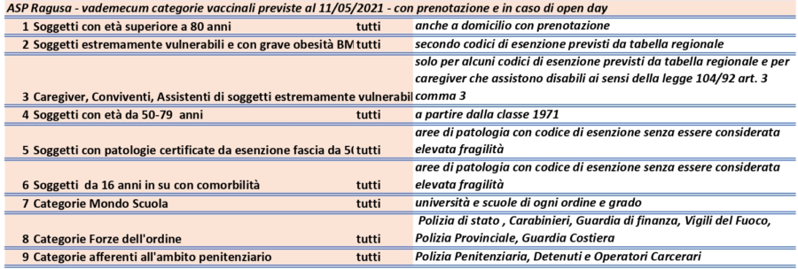 Soddisfazione del Sindaco che ha rivolto un sentito ringraziamento al Direttore Generale per la sua sensibilità nell’avere accolto le istanze dei cittadini. Nella sede di contrada Zagarone continueranno gli appuntamenti per l’esecuzione dei test rapidi. Di seguito le categorie vaccinali: