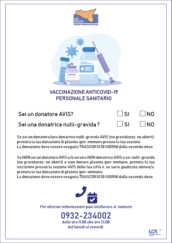 Il Simt – Servizi di Immunoematologia e Medicina Trasfusionale – dell’Asp di Ragusa, direttore dr. Giovanni Garozzo, ha predisposto alcune specifiche raccomandazioni sull’eleggibilità alla donazione di sangue ed emocomponenti per soggetti con anamnesi positiva per somministrazione di vaccino anti-SARS-CoV-2”. Nello specifico, le indicazioni riguardano se si è un/una donatore/trice AVIS; e se si è una donatrice nulli-gravida (no gravidanze, no aborti).