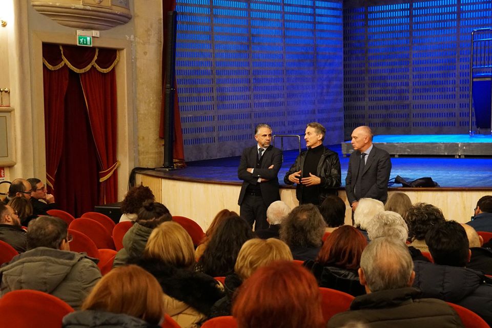 Fare i conti con la disabilità significa prendere coscienza di quanto poco attenti, poco consapevoli e formati siamo quando si parla di handicap. Siamo avvezzi a trattarla come un argomento che non ci riguardi in prima persona, quasi un tabù di fronte al quale è meglio girare la testa. Ma quando ti ci ritrovi faccia a faccia tutto cambia: capisci quanto poco ne sai e quanto poco capace sei nell’affrontarla, oltre a renderti conto di quanto sarebbe importante invece essere “educati alla disabilità”. Sei costretto a confrontarti con una nuova dimensione, che intacca drasticamente la tua quotidianità, persino la tua sessualità, e spesso lo devi fare da solo o in compagnia di chi ha vissuto e sta vivendo la tua stessa situazione. Parole forti, che fanno riflettere, ma che sono il vero insegnamento di vita che il dramma vissuto in famiglia ha lasciato a Cesare Bocci, il noto Mimì Augello de Il commissario Montalbano. A lui il Teatro Garibaldi di Modica ha dedicato lo scorso fine settimana, prima con lo spettacolo Pesce d’Aprile, insieme a una bravissima Tiziana Foschi, che ha riscosso un doppio sold out sabato e domenica, e poi col pomeriggio di confidenze, sempre al teatro modicano, che ieri Bocci ha regalato al suo affezionato pubblico. A fianco a lui il sindaco, presidente della Fondazione Teatro Garibaldi, Ignazio Abbate, e il sovrintendente Tonino Cannata.