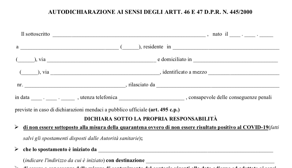 Covid e ‘fase 2’: si continua con l’autocertificazione per gli spostamenti. Ecco il nuovo modello online