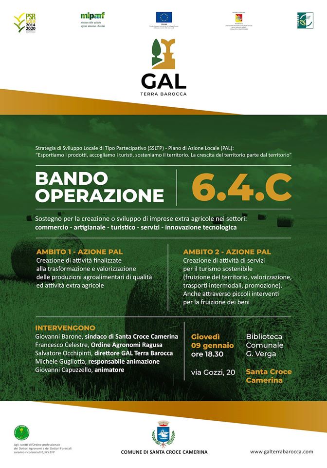 Continuano i focus di approfondimento con gli operatori economici locali sui bandi stanziati dal GAL Terra Barocca che coinvolge i Comuni di Ragusa, Modica, Scicli, Ispica e Santa Croce Camerina e destinati ad attività imprenditoriali nuove o già esistenti. Domani a Santa Croce Camerina e venerdì a Ispica sono, infatti, in programma due nuovi incontri informativi sui bandi emessi dal GAL Terra Barocca per la misura 6.4.C del Psr, per un totale di quasi due milioni di euro in favore di imprese private e start up extra-agricole nei settori commercio, artigianato, turismo, servizi e innovazione tecnologica.