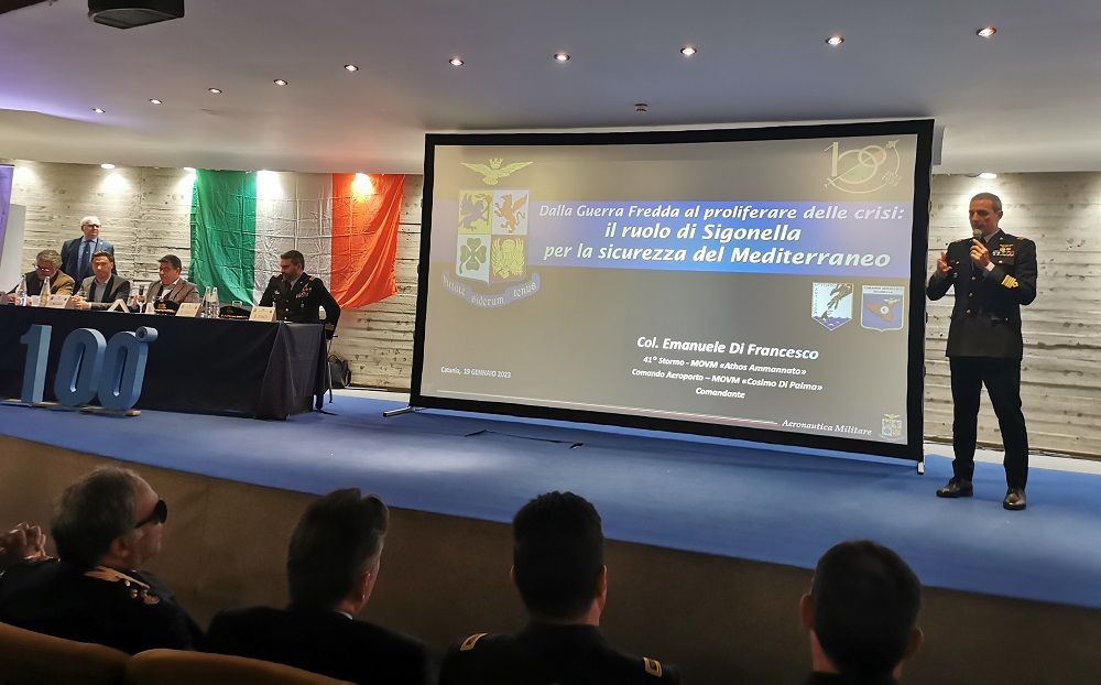 Giovedì 19 gennaio 2023, presso l’auditorium del centro fieristico “Le Ciminiere” di Catania, si è svolto il convegno “L’Aeronautica Militare al servizio della sicurezza nazionale e internazionale, L’importante ruolo della Sicilia”, organizzato dall’Associazione Arma Aeronautica – Aviatori d’Italia, ottavo di una serie di convegni in programma in 15 città, per ripercorrere la storia e la realtà dell’Aeronautica Militare, in vista del centenario della sua fondazione, il 28 marzo 2023, realizzato con l’attivo contributo delle amministrazioni locali, università, industria, della Sezione A.A.A. di Catania, del 37° Stormo di Trapani e del 41° Stormo e dell’Aeroporto di Sigonella. I saluti di rito alle autorità regionali, provinciali e comunali, civili, militari e religiose ed agli oltre 600 partecipanti, in prevalenza studenti degli istituti superiori, sono stati portati dal gen. Giovanni Fantuzzi, Direttore del Centro Studi Militari Aeronautici (CESMA) dell’A.A.A., co-organizzatore del simposio, che ha sottolineato il forte legame tra l’Aeronautica Militare e la Sicilia, e dal gen. Nazzareno Cardinali, Presidente della Sezione Roma 2 “Luigi Broglio” dell’A.A.A., che ha illustrato brevemente il progetto dei 15 convegni itineranti ed il concorso a premi “Da un secolo in volo verso il futuro”, dedicato agli studenti degli istituti scolastici delle provincie sedi dei convegni.