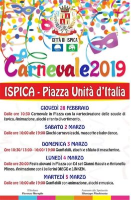 Ed infine ecco il nutrito programma carnascialesco del comune di Scicli, dove torna il Carnevale della Stradanuova nell’omonimo e storico quartiere popolare, per iniziativa dell’associazione Prismart col patrocinio dell’amministrazione comunale. L’inizio è fissato per domani alle 16 dalla Stratanova – Corso Umberto I, con la Parata di apertura, accompagnata dalla Banda Busacca – Borrometi. La domenica si partirà la mattina alle 10,30 in Piazza Italia, con la Festa dei Bimbi e il Vespa Club di Sampieri. In serata cabaret con Carlo Kaneba, Mariuccia Cannata e Antonella Cirrone. Chiuderà il maestro Carmelo Errera. Lunedì un pomeriggio dedicato alla Korrida a cura di Tecne 99. Martedì 5, ultimo giorno di Carnevale, il pomeriggio con la Parata di chiusura, guidata dalla Banda Ottavio Penna. Premio per le migliori maschere, e dj set di Insonnia e Offset.