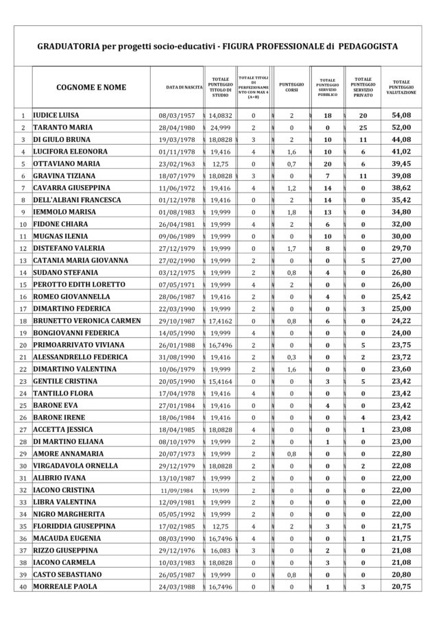 Riportiamo le suddette graduatorie provvisorie inerenti le figure di assistente sociale, mediatore linguistico culturale e pedagogista