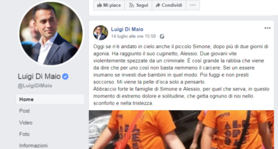 Il vice premier, domenica scorsa, dopo aver appreso della morte di Simone, aveva dedicato ai due cuginetti vittoriesi questo post: “Oggi se n’è andato in cielo anche il piccolo Simone, dopo più di due giorni di agonia. Ha raggiunto il suo cuginetto, Alessio. Due giovani vite violentemente spezzate da un criminale. È così grande la rabbia che viene da dire che per uno così non basta nemmeno il carcere. Sei un essere inumano se investi due bambini in quel modo. Poi fuggi e non presti soccorso. Mi viene la pelle d’oca solo a pensarlo. Abbraccio forte le famiglie di Simone e Alessio, per quel che serva, in questo momento di estremo dolore e solitudine, che getta ognuno di noi nello sconforto e nella tristezza”.
