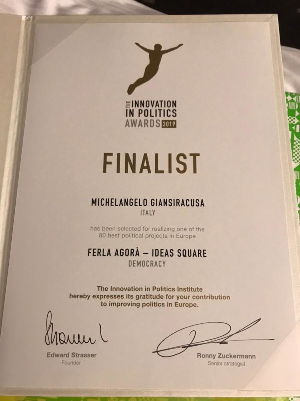 “Orgogliosi di aver rappresentato l’Italia e di essere tra le 10 migliori buone pratiche d’Europa”. Commenta così un emozionato ed orgoglioso Michelangelo Giansiracusa, sindaco di Ferla, la partecipazione del proprio Comune alla terza edizione dei prestigiosi premi Innovation in Politics Awards, che riconoscono il lavoro politico messo in campo per migliorare la nostra vita di europei. A contendersi il premio nella categoria “Democrazia” i finalisti erano in dieci, tra i candidati in rappresentanza di Olanda(2), Svezia(1), Francia(1), Germania(3), Lituania(1) e Svizzera(1) c’era anche la piccola comunità montana di Ferla con il progetto Agorà scelta tra le migliori best practice di tutta Europa. Un traguardo di grande prestigio per il sindaco Giansiracusa e la sua città, ormai da anni tra i “Comuni Virtuosi” d’Italia per aver proposto ed adottato politiche innovative di grande impatto per la cittadina siracusana e non solo. Dalla strategia “Rifiuti zero” ad un modello di sviluppo totalmente ecosostenibile con il progetto “Borgo Albergo”, un innovativo programma per lo smaltimento e la differenziazione dei rifiuti, edilizia sostenibile e riqualificazione energetica, sono alcune delle “buone pratiche” adottate dal Comune di Ferla (2500 abitanti), guidato da Giansiracusa, entrata a far parte del circuito dei Borghi più belli d’Italia e il cui operato è divenuto materia di studio persino all’estero, noi di Ialmo, dopo l’incontro avvenuto lo scorso marzo, ne abbiamo parlato proprio con il primo cittadino. Oggi, un ennesimo traguardo per piccola cittadina iblea dietro al quale si nasconde un grande lavoro di programmazione frutto di un’amministrazione lungimirante e decisamente ormai proiettata verso modelli innovativi ed alternativi di sviluppo. “Per due giorni il comune di Ferla è stato protagonista a *Berlino* partecipando ai lavori e alle premiazioni della terza edizione di *Innovation in Politics Awards*, il contest europeo di politica innovativa. In particolare nella giornata del 3 dicembre al nostro progetto è stato dedicato un importante tavolo tematico che ha interessato amministratori ed innovatori di tutta Europa. Ferla era in lizza per la categoria Democracy. Ha vinto l’esperienza proveniente dall’Olanda ma siamo orgogliosi di aver, comunque, rappresentato l’Italia e di essere tra le 10 migliori buone pratiche d’Europa in tema di politiche innovative sulla democrazia”.