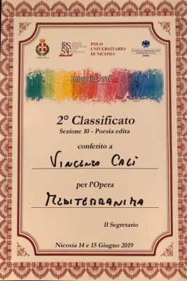 Tra le tante premiazioni, citiamo i premi “Poesia Edita – Sezione 10” e “Menzione speciale” conferiti al poeta e scrittore siciliano Vincenzo Calì che, con la sua opera “Meditterranima”, racconta in versi le tele e i dipinti del maestro Chinnici. Meditterranima è il risultato di una narrazione che vuole essere sia interpretativa dei sentimenti e degli stati d’animo dei protagonisti dei dipinti di Chinnici, sia storica. perché racconta l’anima della Sicilia per cui è difficile non provare nostalgia: una Sicilia senza tempo, fatta di contadini, lavandaie, pescatori e massaie. I versi del poeta richiamano le tradizioni e la storia della Sicilia del passato, attraverso il racconto delle tele del Chinnici, e l’odore del mare che sembra uscire dalla poesia stessa. Vincenzo Calì durante la premiazione ha spiegato: “Questo libro racconta la storia, ma soprattutto le origine e le fatiche dei nostri padri, dei nostri avi, e vuole essere, oltre che memoria di Sicilia, un patrimonio da preservare”. Lo scrittore, nel luglio dello scorso anno, in occasione delle mostra internazionale Chinnici presso il Comune di Caltagirone, ha donato i versi intitolati “Calatagèron” e presentato, per la prima volta, “Meditterranea”, omaggiando le tele del maestro con dei versi scritti appositamente per quell’evento.
