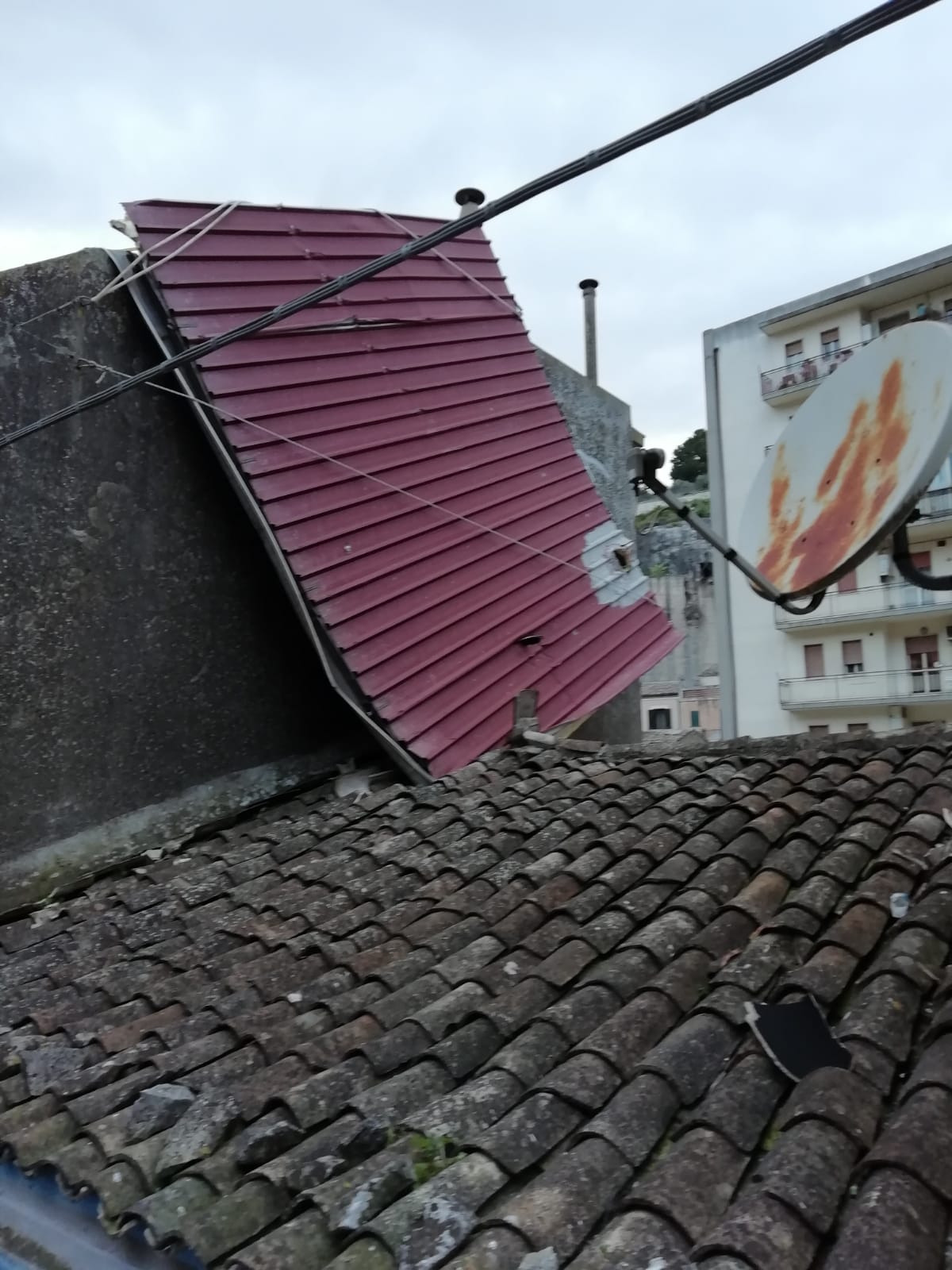 A Ragusa il tetto di una casa è volato via ed è precipitato in strada, in via Buonarroti. Per fortuna, nessuno è rimasto ferito ma alcune auto in sosta sono state danneggiate e sono dovuti intervenire i vigili del fuoco per mettere in sicurezza la zona.